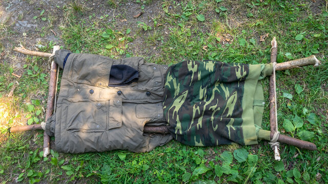 The first medical aid.The scouts made a sanitary stretcher out of improvised materials in the woods. Sanitary stretcher for carrying people with injuries in the field.