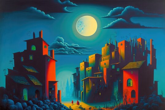 Colorfully painted shanty town shacks and haphazardly built settlement homes, improvised village on a hill, midnight moon sky, densely populated favela - generative AI.