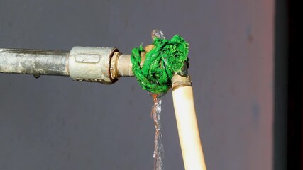 A close-up view of a leaking metal pipe joint wrapped with a bright green rope, dripping water that reflects an improvised plumbing repair and the issue of water scarcity in Indian villages.