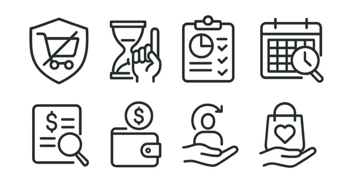 Line style icons of financial discipline: no impulse spending badge, wait-before-buying icon, budgeting habit tracker, review expenses weekly, set limit icon, savings reminder, mindful spending icon,