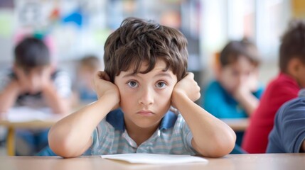 Adhd awareness month campaign with thoughtful caucasian boy in classroom