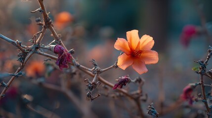 imprecise. A lone vibrant flower blooms among thorny bushes in a serene morning garden. gardening catalogs, home-decor guides, designed for gardening and botanical catalogs.