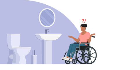 Unhappy young black woman suffering from lack of wheelchair friendly facilities, cannot get home without ramp, copy space. Inaccessible city environment for people with special needs concept