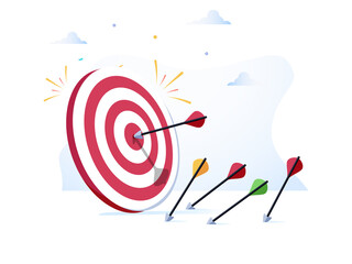 Many arrows missed their target. Several unsuccessful inaccurate attempts to hit the target of archery. Metaphor for failure in business. Fail concept, Vector illustration