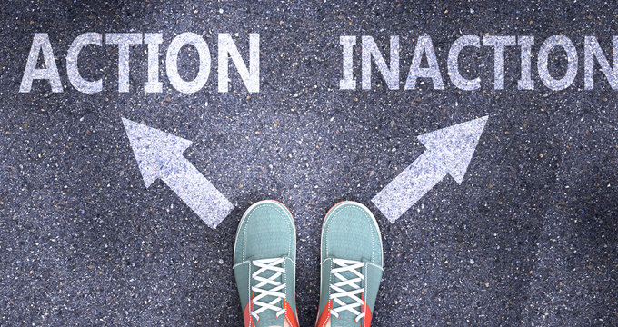 Action and inaction as different choices in life - pictured as words Action, inaction on a road to symbolize making decision and picking either Action or inaction as an option, 3d illustration