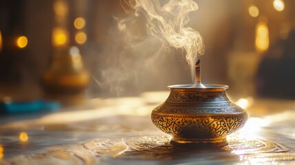 Intricate gold incense burner with smoke creates warm ambience for mindfulness ritual