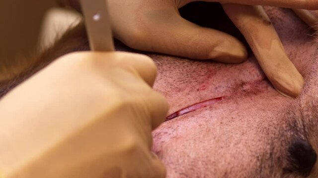 The veterinarian makes an incision on the dog's skin. The first stage of surgery.