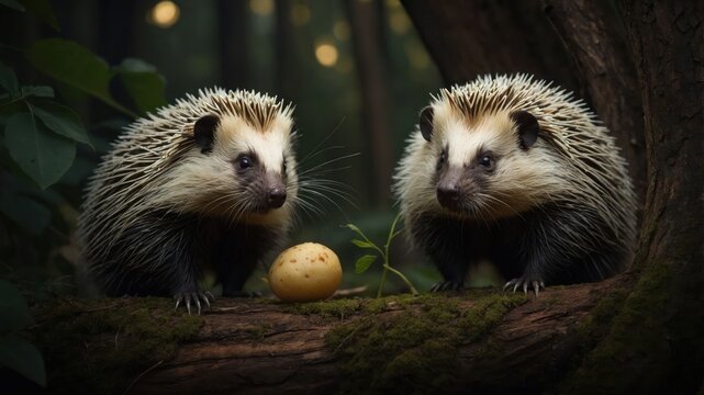 Two hedgehogs curiously observe a small egg on a mossy log in a serene forest setting