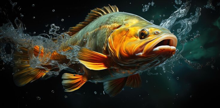 A shimmering goldfish gracefully glides through the clear blue waters of its aquarium, its delicate fins propelling it forward in a mesmerizing display of marine biology