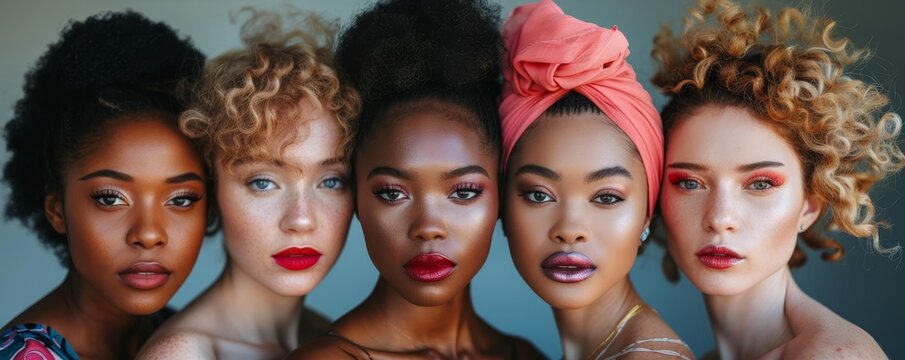 Group portrait of diverse women showcasing natural beauty and smooth skin. Beauty and skincare concept. Design for inclusive beauty brand campaign, diversity in fashion editorial
