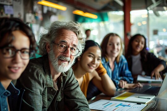 An older man and a diverse group of people collaborate in an office setting, symbolizing teamwork, experience, and the blending of different perspectives in a modern workplace.