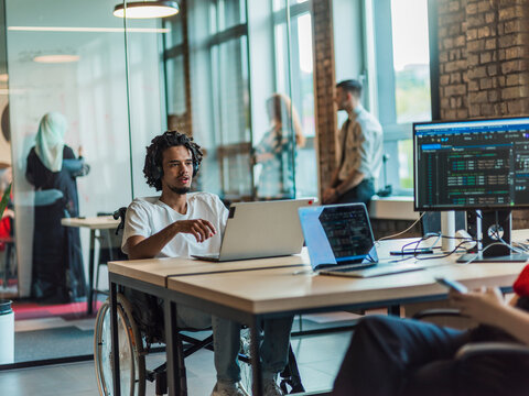 Man in wheelchair working in inclusive AI tech agency providing software development services. IT worker with disability using machine learning to streamline coding process in startup office, camera B