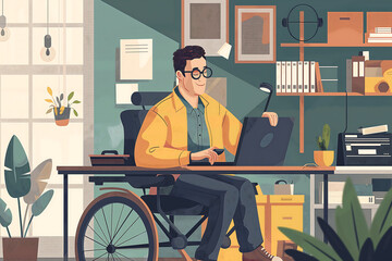 Man in wheelchair working on laptop in home office modern workspace digital technology inclusive productivity remote work professional accessible design ergonomic organized environment