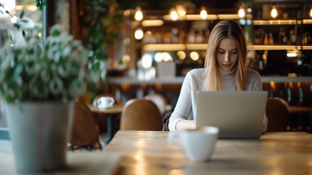 Focused woman working remotely on laptop at a cafe table with coffee. Represents modern productivity, independent work, and digital lifestyle.
