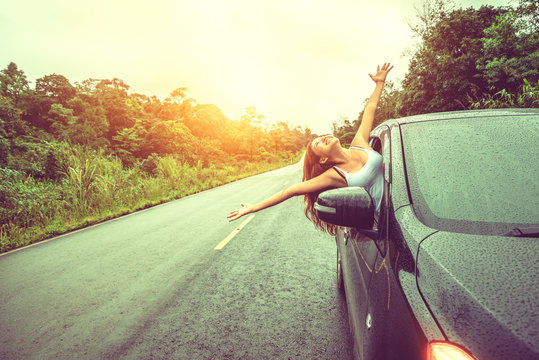 Asian women travel relax in the holiday. driving a car traveling happily.