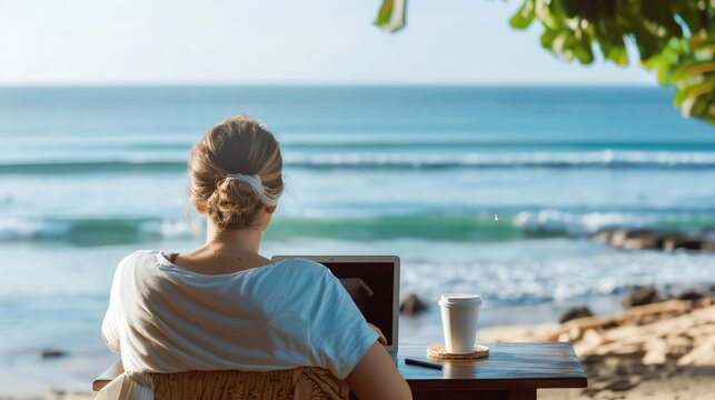 Digital nomad at a beachside cafe with a laptop, Gig economy, location-independent work