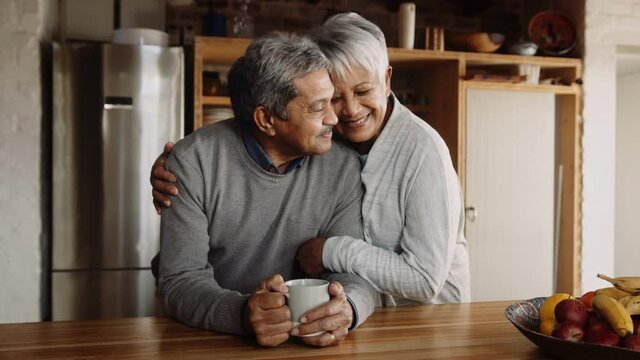 Multi-cultural elderly male in retirement drinking coffee in kitchen, joined by happy wife