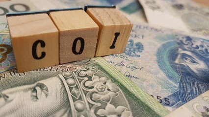 Polish PLN banknotes and COI inscription made of letter cubes. Savings bonds indexed to inflation