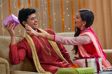 Happy indian brother giving gift or present to sister after tying rakhi at home during raksha bandhan festive celebration - concpet of Sibling Love, Happy Moments and Family Bonding