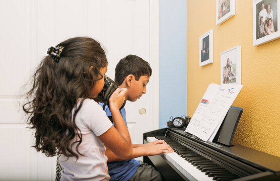 Little sister taking photos of her brother while he plays the piano