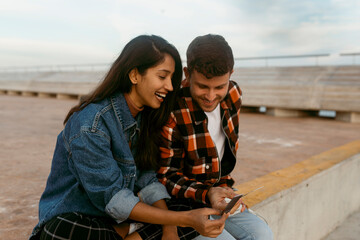 Planning vacation. Happy young indian couple searching tour online, using laptop computer, sitting on couch in cozy living room interior at home, free space