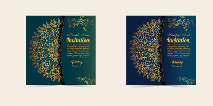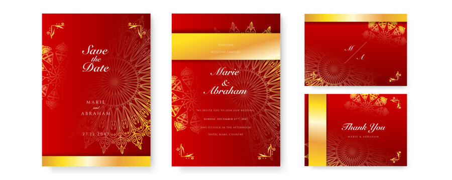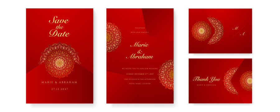 Royal red wedding invitation card design with golden mandala and abstract pattern