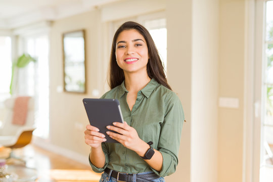 Beautiful young woman working using touchpad tablet