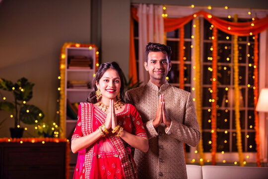 Indian young couple celebrating diwali at home posing for photograph