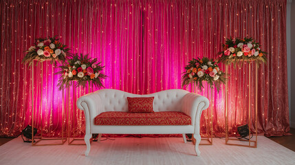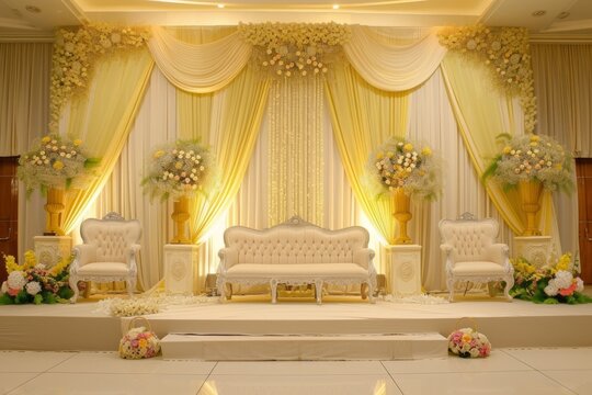 Beautiful flowers cover the stage decorations for an Indian wedding. Duplicate the image of space Location for text or design additions