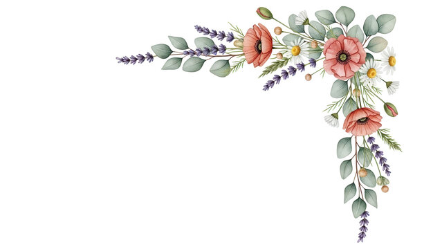 Elegant watercolor corner frame featuring wildflowers and eucalyptus in muted terracotta isolated on white background