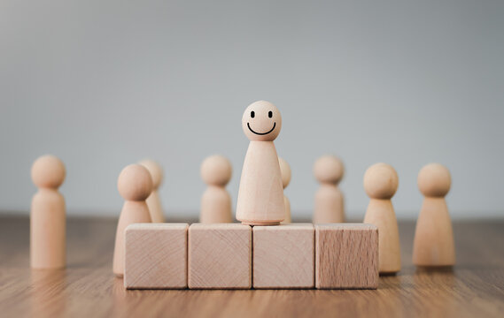 Hand placing a blue puzzle piece shaped like a person into a background of gray human figures, symbolizing individuality and teamwork in collaboration. Concept of unity and diversity.