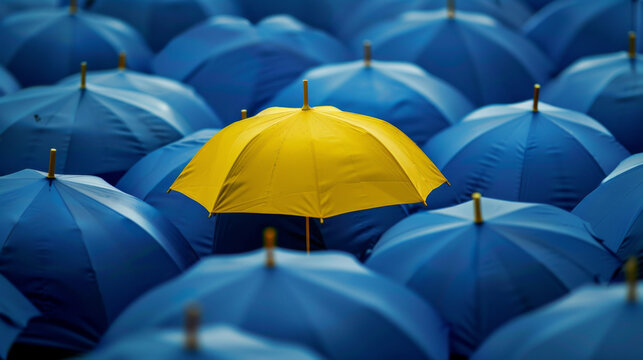 A yellow umbrella stands out from the crowd of blue umbrellas, symbolizing unique individuality and self-expression