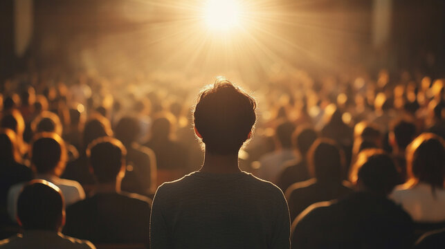 Light beam illuminating the back of a person in a crowd, emphasizing focus, individuality, and presence amidst surrounding figures, creating a dramatic and visually striking composition