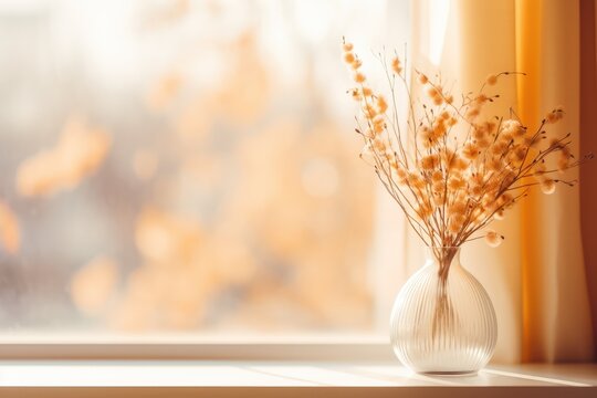 Cozy indoor setting with a window view of November's amber-hued landscape, bringing out the month's nostalgic charm - AI Generated
