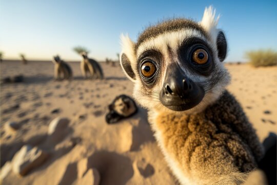 a ring-tailed lemur sitting on top of a sandy beach, surrounded by a few other lemurs in the background The sky is visible at the top of the image, and the backgro