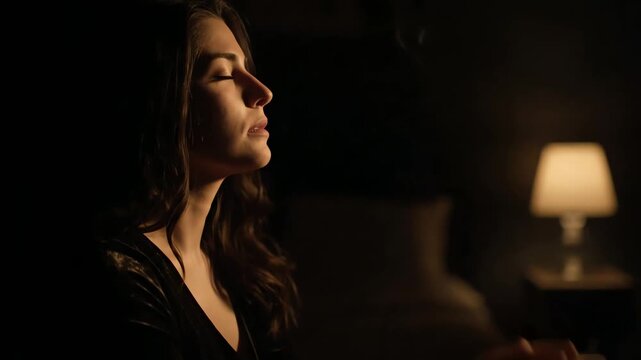 Pensive woman exudes solitude, taking a cigarette in a dimly lit room, creating a moment of introspection and quiet indulgence with warm lamp light