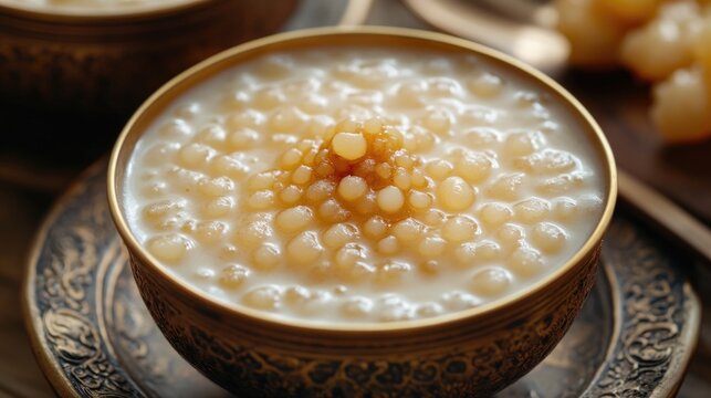 A delicious and indulgent creamy rice custard served in a gold cup, perfect for dessert or as a traditional meal component.