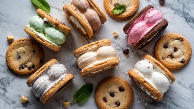 Premium ice cream sandwiches collection featuring mint chip, vanilla and berry flavors between chocolate chip cookies on elegant marble surface