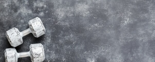 White rustic dumbbells on dark concrete background with copy space. Vintage fitness equipment for strength training and home workouts. Minimalist gym photography. 8k banner backdrop