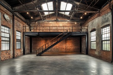 Interior view of empty industrial loft space with brick walls and metal staircase, architectural photography, warehouse conversion, daylight studio