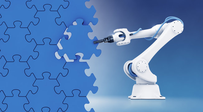 Action Show of Industrial Robotics. A mechanical arm of an industrial robot that assembling a wall from pieces of a jigsaw puzzle. 3d rendering graphic composition on the theme of Industrial Robotics.