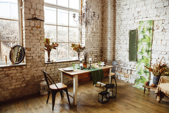 Modern living room interior in loft industrial style with furniture