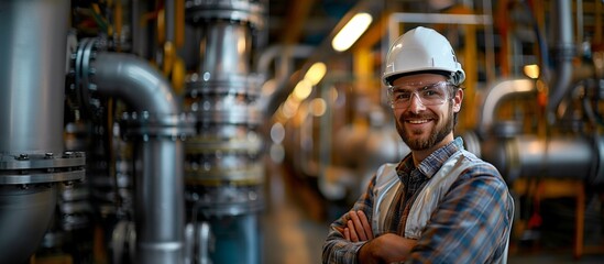 A Distinguished Caucasian Male Engineer Smiling With Arms Crossed, Industrial Environment, Risk Mitigation Concept, PPE, Copy Space.