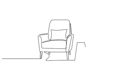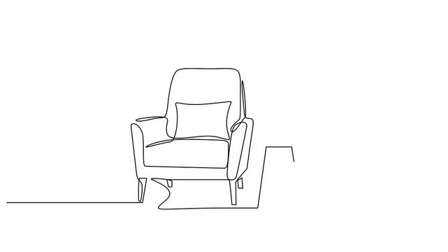 Animation of single one line drawing stylish Armchair and table with vase with home plant. Comfortable armchairs with industrialist reading lamp. Full length motion