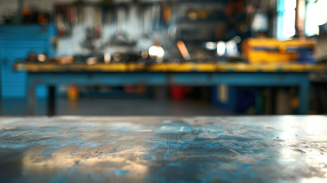 An empty metal table with blurred car repair tools and parts in the background, ideal for automotive product marketing.