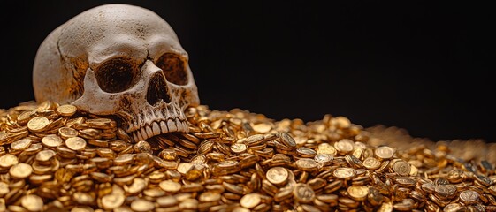 A skeleton rests atop aheap of gold coins, symbolizing treasure and the inevitability of death. A striking, eerie image.