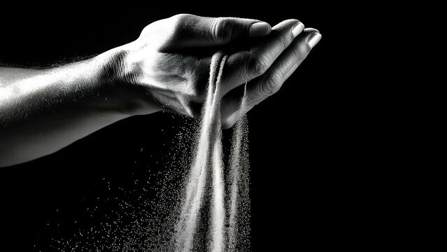 Conceptual image: Sand slipping through fingers highlights the fleeting nature of moments and memories. The delicate grains of sand symbolize time, highlighting the inevitability of change and loss.