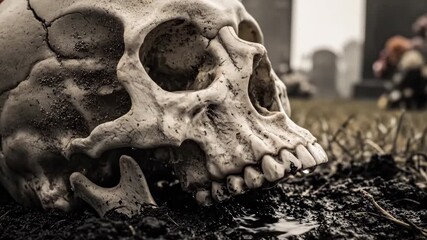 Close-up of a skull resting in the ground, symbolizing mortality and the inevitability of death