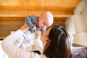 Mother playing with small baby holding him up in air. Unconditional paternal love, mother's Day concept.