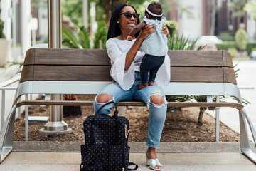 Mom holding bag and toddler daughter walking